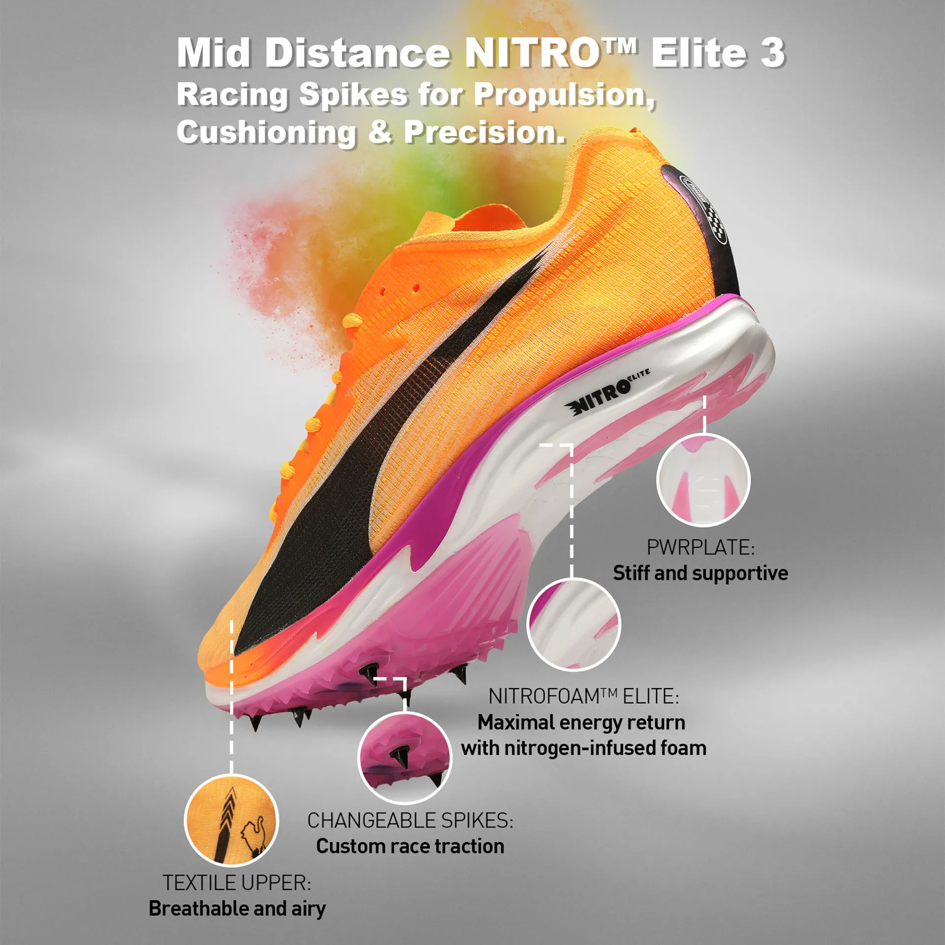 Leggerezza e precisione. Grazie all’ammortizzazione NITROFOAM™ ELITE e alla piastra in fibra di carbonio PWRPLATE per una spinta esplosiva, questa scarpa da gara è pronta per la pista. La tomaia traspirante e priva di sfregamenti, unita al tallone avvolgente, ti offre una calzata stabile e confortevole.